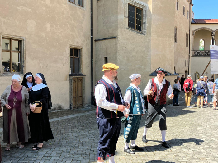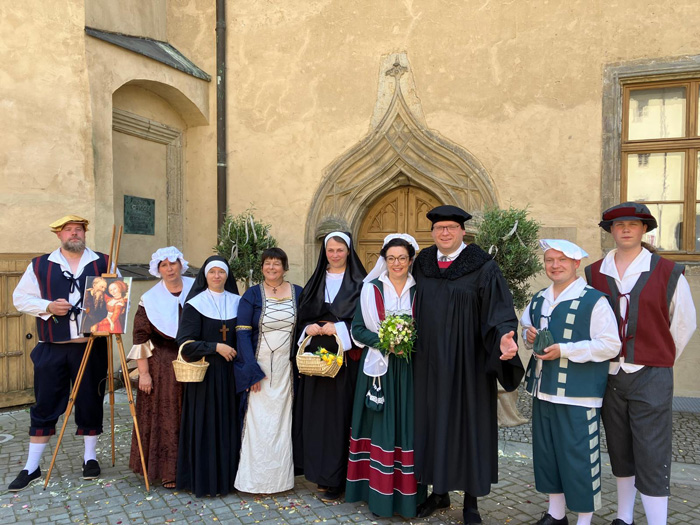 Vom 13. bis 15. Juni 2025 feierte die Lutherstadt Wittenberg sein traditionsreiches Stadtfest "Luthers Hochzeit". Ein ganz besonderes Jubiläum – 500 Jahre ist es nun her, dass Martin Luther und Katharina von Bora den Bund fürs Leben schlossen. An diesem sommerlichen Wochenende erlebten die Besucher die Geschichte von Mut und Liebe in 13 einzigartigen Erlebniswelten. Zwischen mittelalterlichem Markttreiben, Handwerk, Musik und Gauklern war auch das Amateurtheater Wolfen im historischen Hof des Lutherhauses vertreten – genau an jenem Ort, an dem das berühmte Ehepaar am 13. Juni 1525 getraut wurden und viele glückliche Ehejahre verbrachten. Unsere Darsteller nahmen die Gäste mit auf eine lebendige Reise: Bei mittelalterlichen Klängen verkörperten sie die entflohenen Nonnen, die einst gemeinsam mit Katharina aus dem Kloster Nimbschen flohen. In ihre Erzählungen mischten sich Erinnerungen, Legenden und Geschichten von Männern, Hoffnungen und Errungenschaften. Insgesamt sieben Nonnen und drei edle Herren – darunter auch Lucas Cranach – erweckten den Hof des Lutherhauses zum Leben. Jede Figur brachte persönliche Habseligkeiten mit, die ihr Wesen und Leben symbolisierten. So wurden u.a. Nüsse, Äpfel und Rosen mit dem Publikum geteilt. Ein besonderer Höhepunkt waren die Rezitationen zu jeder vollen Stunde: Ein intensiv geprobtes Gedicht, das die Flucht der Nonnen eindrucksvoll darstellte. Die Texte stammten von Andreas Hillger, mit dem bereits bei der "Nacht im Mausoleum" im Jahr 2024 erfolgreich zusammengearbeitet wurde. Am 14. Juni 2025 wurde so im Lutherhof Geschichte auf lebendige und unterhaltsame Weise zum Leben erweckt.